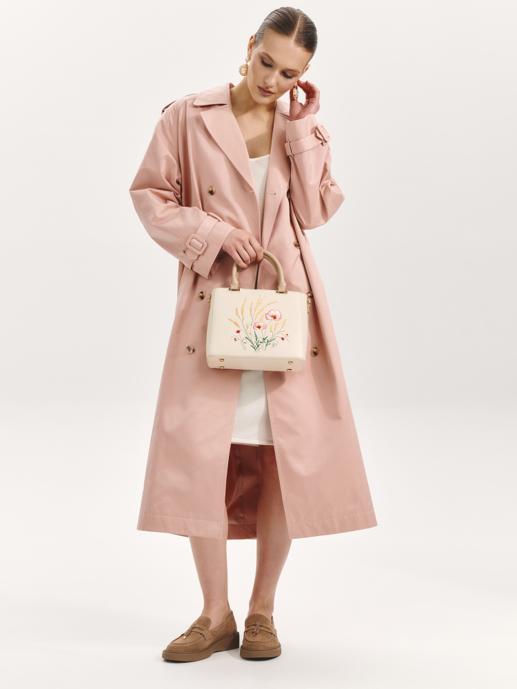 Нежный цветочный рисунок на сумке кажется принтом, если смотреть издали. Но на самом деле все интереснее и нежнее — это вышивка. Такой необычный акцент великолепно сочетается с образами в нежных пастельных оттенках, как и лоферы из натуральной замши в универсальном бежевом цвете.